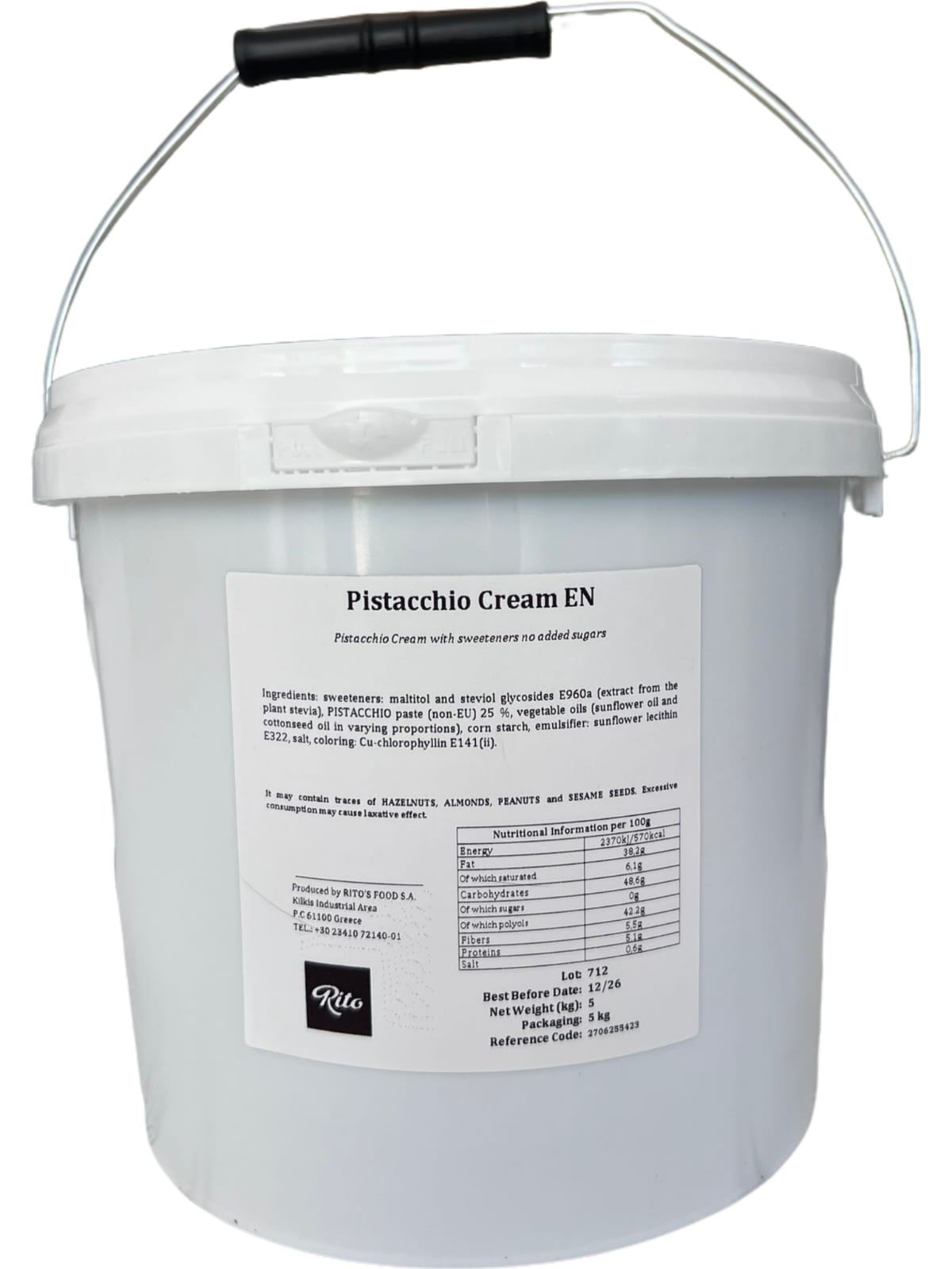 Indulcitori: maltitol si steviol glicozide ( extract din planta stevia), pasta de FISTIC 25%, grasimi vegetale ( ulei de floarea soarelui, ulei de seminte de bumbac in proportii variabile), amidon din porumb, emulsifiant: lecitina din SOIA, sare, colorant clorofila.